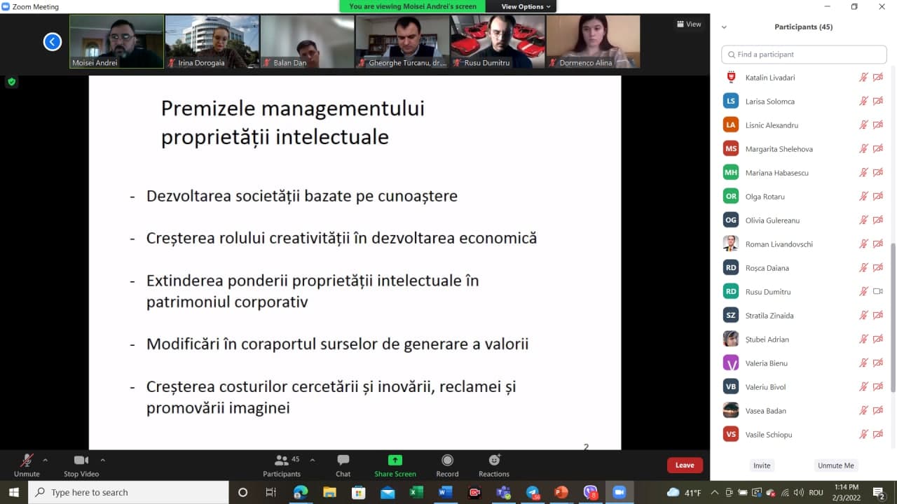 Joi, 3 februarie 2022, în cadrul Cercului științific studențesc „Managerul de succes” a fost organizată o masa rotunda online cu genericul ,,GESTIONAREA DREPTURILOR DE PROPRIETATE INTELECTUALĂ PENTRU AFACERILE INOVATIVE”.